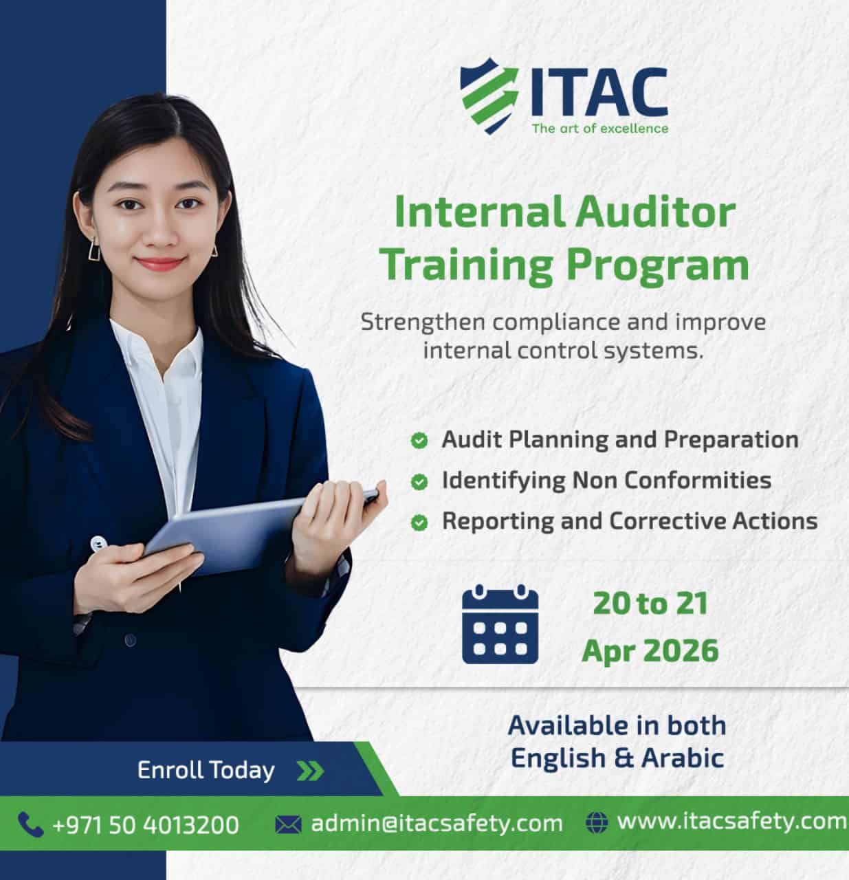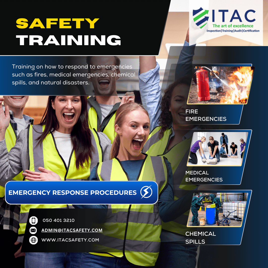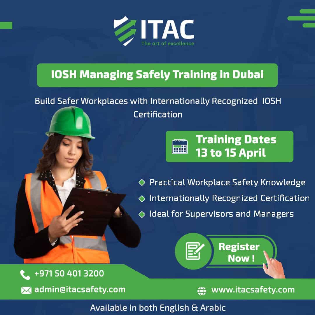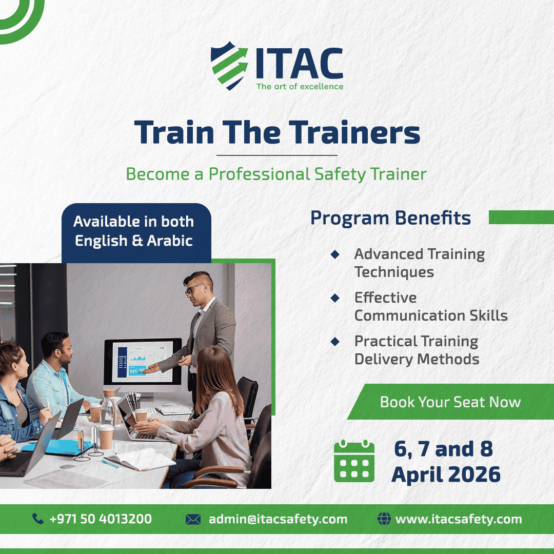 Our courses are delivered in a flexible and engaging manner, with the help of our knowledgeable instructors who are well-versed in the field of occupational health and safety training. At ITAC Safety, we take pride in providing industry professionals with the highest quality of health and safety training that helps individuals pursue their careers as certified safety professionals in UAE. To learn more about our courses or to sign up for one today, please call us at 050 4013210 or email us at admin@itacsafety.com today!